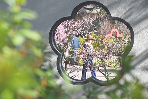 ◎ 一月十二日,遊客在公園內漫步賞梅…