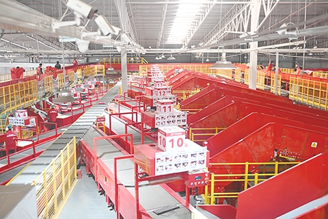 ◎ 一月二十二日,在位於甘肅省蘭州市一快遞物流轉運中心內,工作人員進行分揀工作。據蘭州市郵政管理局透露,近三天春節年貨快遞寄遞量日均超過二百萬件,達到高峰。(中新社記者 李亞龍 攝)