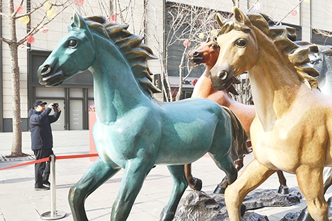 ◎ 一月二十九日,在北京王府井大街上,中國工藝美術大師朱炳仁的作品《王府八駿》吸引遊人駐足觀賞。馬年將至,北京一些與馬相關的藝術裝置紛紛亮相,盡顯年味。(中新社記者 易海菲 攝)