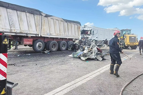 ◎ 埃及東北部塞得港省二月十九日發生一起嚴重交通事故,已造成十八人死亡、三人受傷。據埃及代蓋赫利耶省發佈的聲明,事故涉及一輛重型貨運卡車和一輛運送工人的皮卡車。圖為當日在埃及東北部塞得港省拍攝的車禍事故現場。(新華社發)