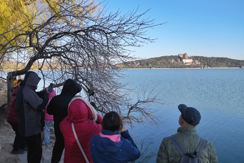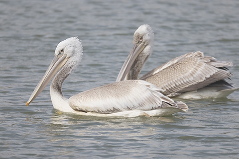 ◎ 十一月二十六日,河南省靈寶市金水湖內,兩隻越冬停歇的卷羽鵜鶘在湖面游弋。(中新社發 張明雲 攝)