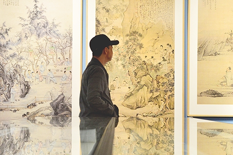 ◎ 十一月二十六日,展出的歷代繪畫精品圖像調色打樣稿吸引市民觀賞。「盛世修典──『中國歷代繪畫大系』成果展.福州特展」正在福州畫院舉行,集中展出三百一十幅「大系」收錄的歷代繪畫精品圖像調色打樣稿。(中新社記者 張斌 攝)
