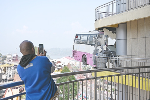 ◎ 一月六日,遊客在重慶涪陵拍攝「大巴穿樓」景觀。日前,重慶涪陵美心紅酒小鎮新添「大巴穿樓」景觀。一輛巴士「懸停」在建築外牆之上,宛如從空中駛入樓宇,營造出極具衝擊力的視覺效果,成為遊客體驗「8D魔幻」山城的新場景。(中新社記者何蓬磊 攝)
