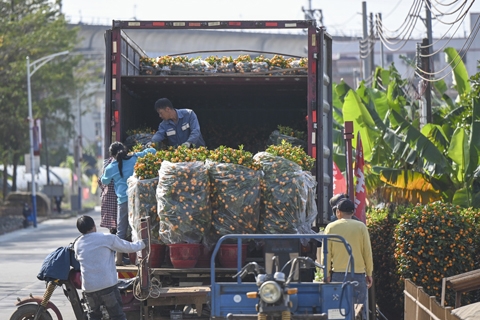 ◎ 二月三日,廣東廣州都那村年桔種植基地的果農將年桔搬運上貨車。都那村是廣州著名的年桔種植村,有著「年桔之鄉」之稱。隨著馬年春節的臨近,都那村內的年桔進入銷售高峰期。(中新社記者 陳驥旻 攝)