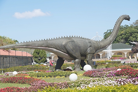◎ 農曆年假中,台灣不少民眾前往苗栗西湖渡假村參觀「動態實境恐龍特展」,園區內總共打造九大恐龍主題區,每一區的大恐龍都超過三層樓,最長超過十五米,每一隻恐龍在遊客靠近時都會跟遊客做互動。(香港中通社圖片)