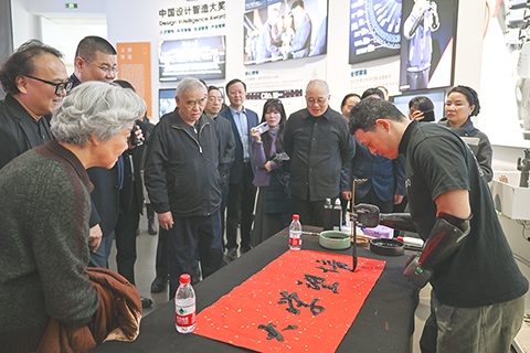 ◎ 二月廿三日,浙江杭州,感應腦電波信號的智能義肢書寫的「大學望境」吸引嘉賓。當日,「大學望境--中國美術學院建設世界一流大學二十周年特展」在中國美術學院美術館開幕。展覽以「人民之心、哲匠精神、藝科融合、無牆學院、美美與共、匯通中外」六個踐行脈絡為綱,展出二十個發展案例。(中新社記者 王剛攝)