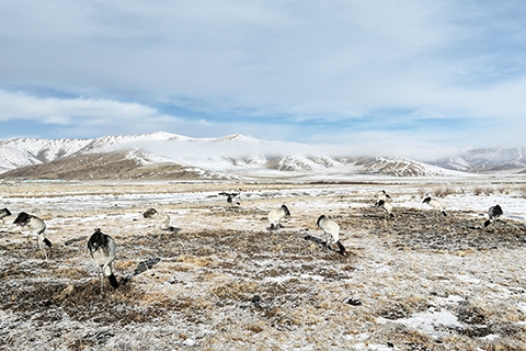 ◎ 三月廿九日,黑頸鶴在四川省紅原縣的草原上覓食。近日,北返遷徙的黑頸鶴在四川省紅原縣的草原上覓食,這些精靈以其優雅的姿態和高亢的叫聲成為草原上的一道亮麗風景線。(新華社發 謝宏程攝)