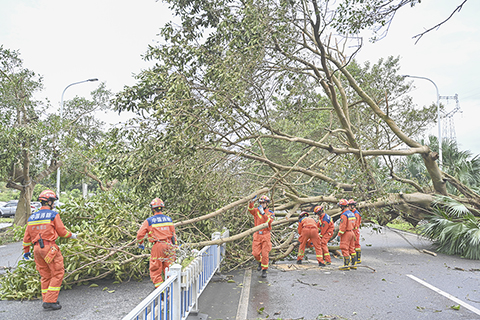 記者二十五日探訪颱風登陸過後的海陵島,看到道路上粗壯的大樹被颱風掀翻,橫亘在道路中央,樹枝、樹葉散落滿地。一些商家和樓盤的招牌被吹飛,消防人員和路政人員正清理路面。