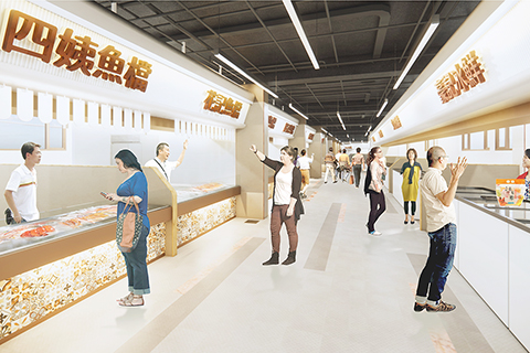 在整體佈局方面,計劃將所有鮮活食品攤檔集中於地面層經營,發揮群聚效應,提升消費者的購物體驗,並按現有售賣種類重新規劃佈局,設魚類售賣區、肉類售賣區、冰鮮售賣區、蔬菜及生果售賣區、傳統百貨攤檔等。一樓則計劃引入熟食中心,設十六個輕食及熟食攤位,把現時地面層的熟食檔遷至一樓經營,並增設逾一百五十個食客座位,滿足商販及居民的訴求。原有的出入口將保留,並會擴闊公共通道及增加攤檔面積,創建更舒適的營商環境及購物動線。一樓熟食區除熟食攤位外,還有適合經營輕食的開放式中島設計攤位,為經營者及消費者提供多元、整潔的環境。