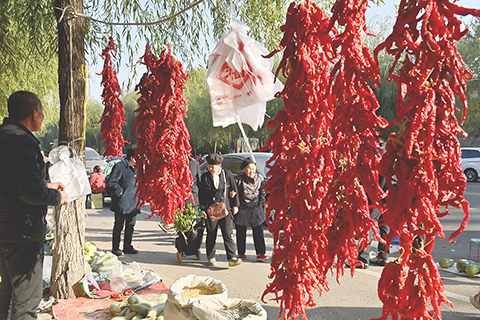 ◎ 十月十六日,吉林長春,紅辣椒被菜農擺在顯眼位置。當下正是中國東北民眾「囤秋菜」的季節,滿載大葱、白菜、胡蘿蔔等秋菜的貨車停靠在長春市區指定銷售區域,市民們穿梭挑選,儲備過冬秋菜。(中新社記者張瑤 攝)