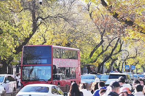 ◎ 十月二十六日,北京天氣晴好,民眾到五四大街賞秋景度周末。(中新社記者 張祥毅 攝)