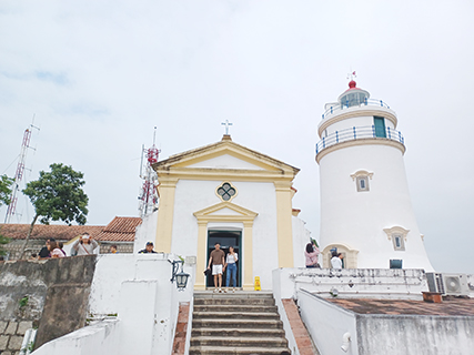 與炮台同時期建造的白色聖母雪地殿教堂(Capela de Nossa Senhora da Guia),具羅馬風格的建築特點,也因為只能參觀而不可拍攝教堂裡面的環境,但遊客可貼近玻璃門向內拍攝。聖母雪地殿教堂歷史悠久,長方形的教堂有兩側牆身較為厚大,以扶壁來承托筒拱結構的屋頂,屋頂外形以紅瓦鋪設,有主祭壇右側設有祭衣房,地方狹窄但也有唱詩台。教堂兩邊壁柱加上三角形山花,還有四瓣型花窗和白色外牆,壁柱和山花以黃色點綴。眼觀的與網上描述相同,教堂內壁有中式描繪聖經故事和人物的壁畫,亦有描繪中國風格的石獅和盆景樹,亦有蝙蝠等圖案,是這教堂獨有的中西文化融合的藝術。◇
