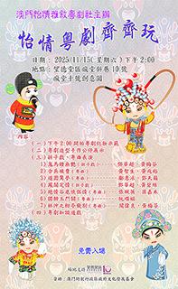 澳門怡情雅敘粵劇社定於2025年11月15日(周六)下午2時,假座望德堂區瘋堂斜巷十號創意園,演出《怡情粵劇齊齊玩》。