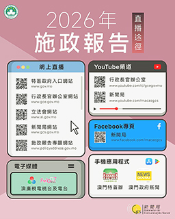此外,新聞局Facebook葡文專頁(www.facebook.com/macaogcspt)及英文專頁(www.facebook.com/macaogcsen),屆時也會發佈二零二六年施政報告的資訊。