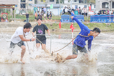 ◎ 十一月五日,二零二五年第十一屆全國農耕健身大賽暨「運動贛鄱.活力江西」江西省第六屆百縣農耕健身大賽在江西省宜春市溫湯鎮開幕。本次大賽設有車水抗旱、木碾犁田、荷塘採蓮、同心鋸木、瓜果豐收、魚塘抓魚六大特色項目,將傳統農事活動與現代體育競技有機結合,吸引了來自全國各省(區、市)及江西省內各縣的共計七十六支代表隊、七百餘名運動員參加。圖為木碾犁田項目中,選手在水田里拉木碾。(中新社記者 劉力鑫 攝)