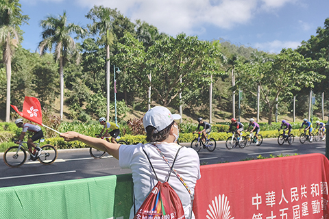 【香港中通社十一月八日電】(香港中通社記者 梁嘉軒)中國第十五屆全國運動會男子公路自行車個人賽決賽八日舉行,車隊當天上午十一時許路過香港迪士尼樂園附近的公眾觀賽區,市民手持國旗和香港特區區旗為運動員打氣,見證全運會歷史上的首個跨境賽事。