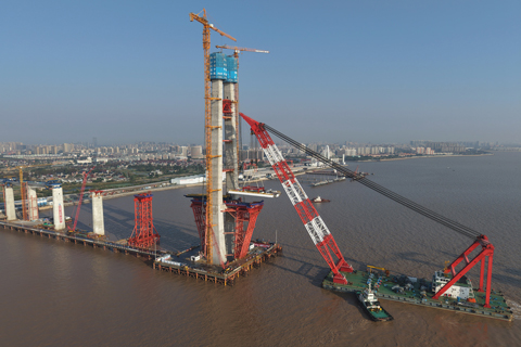 杭州灣跨海鐵路橋北航道橋鋼梁開始架設