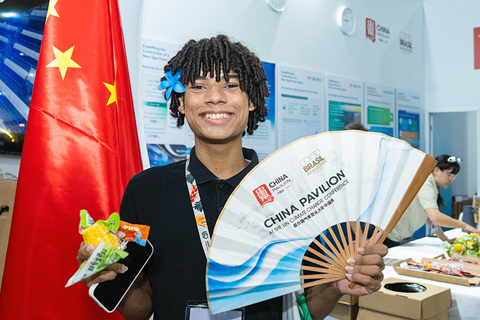 ◎ 《聯合國氣候變化框架公約》第三十次締約方大會(COP30)十一月十日在巴西北部城市貝倫開幕。會場內外,中國的文化產品、綠色科技和創新技術展示受到了與會嘉賓的熱烈關注,成為大會上的一道亮麗風景。圖為十二日,在巴西貝倫,嘉賓在COP30會場內的「中國角」展示折扇。(新華社記者 王天聰 攝)