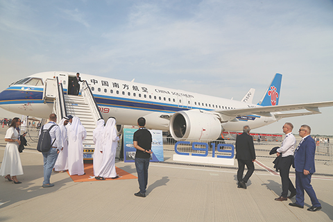 在航展現場的靜態展示區,中國南方航空的C919飛機和中國商飛公司的C909公務機同台登場。這架南方航空的C919飛機採用164座三艙佈局。C909公務機艙內空間寬敞舒適,可靈活設置休息區、會客區、會議區、就餐區等功能區,提供12至29座配置方案,能够滿足客戶多樣化出行需求。