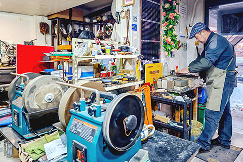 位於天津市河北區的王串場街「修補巷」是全國首個小修小補主題街區,開街已有一年半,通過提供修鞋修表、織補改衣、皮具養護、修車磨刀、修家電改首飾等百餘種便民服務,惠及周邊30萬居民,日均服務千餘人次。圖為11月16日,在「修補巷」,磨刀匠李波為顧客打磨修復一套刀具。◇(中新社記者 佟郁 攝)