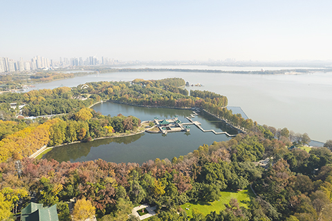 絢麗景致 2025-11-20 03:30:00 ◎ 十一月十九日,航拍湖北武漢東湖初冬絢麗景致。紅楓、梧桐、銀杏等樹木色彩斑斕,與城市建築相互映襯,構成一幅美麗的生態畫卷。(無人機圖片) (中新社記者 張暢 攝)