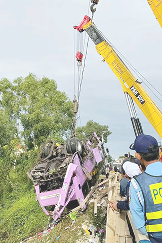 ◎ 柬埔寨警方十一月二十日向新華社記者證實,一輛長途客車當天凌晨在柬中部磅同省撞上橋梁護欄後墜入河中,造成十三人死亡,另有二十多人受傷。圖為當日,工程車輛在柬埔寨磅同省吊起失事客車。(新華社發 柬埔寨磅同省警察局供圖)
