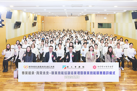 參與活動的獲嘉許者分別完成由社工局、勞工局及婦聯合辦的第五至八期初級育嬰員證照培訓課程;勞工局與婦聯合辦的第一期初級保育師證照培訓課程;婦聯主辦的婦聯托兒所中級育嬰員證照培訓課程和高級保育師證照培訓課程。另外,在十一月初舉行的「江門市第五屆職業技能大賽」中,本澳九位選手在(二級/技師)保育師項目全數通過競賽,其中六位選手包攬一等獎、二等獎及三等獎的優異成績,大會亦對得獎選手進行嘉許。◇