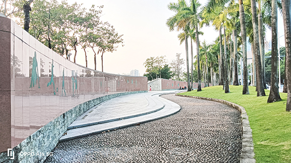 牆體前,是一條寬窄不一的鵝卵石小徑。路徑邊是起伏不大的人工小土堆,土堆上是一片已移栽多年的椰樹。由於保養得當,椰樹似乎是原生一般,特別是樹下的草,雖是冬天,卻乃是一片綠色,生機盎然。
