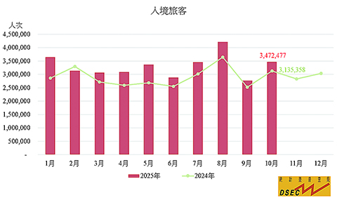 【特訊】統計暨普查局資料顯示,今年10月入境旅客共3,472,477人次,按年上升10.8%。不過夜旅客(2,103,520人次)與留宿旅客(1,368,957人次)較去年同期分別上升17.6%及1.7%。旅客平均逗留時間為1.1日,按年持平,其中留宿旅客的平均逗留時間(2.4日)增加0.1日。