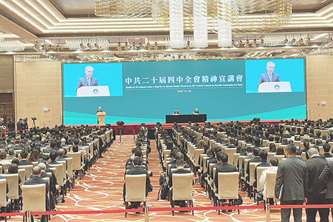 行政長官岑浩輝,中央港澳工作辦公室副主任、國務院港澳事務辦公室副主任、中央人民政府駐澳門特別行政區聯絡辦公室主任鄭新聰分別在宣講會上致辭。岑浩輝致辭時表示,四中全會審議通過國家「十五五」規劃建議,明確「十五五」時期國家經濟社會發展的指導方針和主要目標,亦為澳門特區做好「十五五」時期的工作作出重要戰略部署。特區政府和社會各界必須認真學習深刻領會「十五五」時期國家經濟社會發展的指導思想、主要目標和重大的戰略,進一步增強把握國家發展機遇的責任感、緊迫感和積極性、主動性,將思想和行動統一到中央對「十五五」發展形勢的科學判斷上。岑浩輝又稱,要主動對接國家發展戰略,編製實施好澳門「三五」規劃,提升依法治理的效能,推動經濟適度多元發展,加強與內地經貿、科技、人文等合作,不斷彰顯澳門「一中心、一平台、一基地」的作用,打造國際高端人才集聚高地,更好融入和服務國家發展大局,為推進中國式現代化建設貢獻澳門的力量。