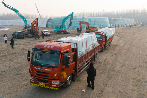 ◎ 十一月二十四日,黑龍江哈爾濱,一輛輛卡車滿載冰塊。當日,第二十七屆哈爾濱冰雪大世界存冰正式啟用,覆蓋了長達十個月之久的「厚棉被」被逐層揭開,二十萬立方米的優質冰晶將陸續被運往驗冰場,經過專業人員的嚴格檢驗,厚度、長度、完整度和潔淨度均達標的冰體,將運送至園區用於冰建景觀建造。第二十七屆哈爾濱冰雪大世界園區內的場地平整、設備入場等前期工作均已就緒,冰建建設將於十一月二十五日正式開工。(無人機照片)(中新社記者趙宇航 攝)