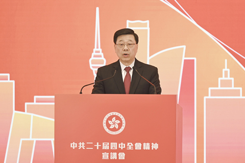 【香港中通社十一月二十五日電】(記者譚暢)二十五日,香港特區政府舉辦中共二十屆四中全會精神宣講會,行政長官李家超出席並進行開場發言時感謝中央對香港的關心與支持,認為中央宣講團成員來港宣講,充份體現了中央對香港的高度重視與殷切關懷。