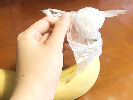 利用保鮮膜包裹香蕉的莖部,可以減緩香蕉的成熟過程,並讓香蕉多保鮮幾天。原理就像花店裡的花束都用保鮮膜包住它們的花冠一樣,加速香蕉成熟的乙烯氣體大部分都是從香蕉串的頂部釋放的,包裹莖部可以減緩氣體的釋放。