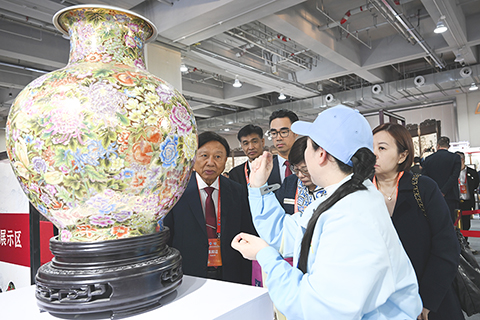 海內外潮籍鄉親參觀廣東(潮州)非遺工藝精品展 2025-11-29 03:30:00 ◎ 十一月二十八日,參加第二十三屆國際潮團聯誼年會的海內外潮籍鄉親在廣東潮州參觀陶瓷。廣東(潮州)非遺工藝精品展匯聚潮州、汕頭、揭陽、梅州粵東四市工藝精華,涵蓋潮綉、陶瓷、木雕、珠綉、麥秆畫等超千件作品。(中新社記者陳楚紅 攝)