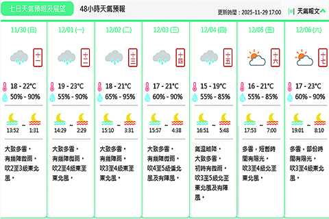 「長幼愛.共融」系列活動啟動禮舉行 推廣長幼共融社區精神 工人醫療所與社工局合辦醫療講座 聚焦濫用處方藥物使用者及社會支援 「開心帶你遊澳門」 介紹青少年愛國愛澳教育基地 「琴澳心橋.藝暖人生」文藝匯演舉行 琴澳殘疾人共演美好畫卷 司警到三校防罪宣教 配合三十多場文化活動 秋季書香文化節一連十日舉行 房屋局辦「家居防火安全」講座 首兩場約兩百社屋長者出席 澳門會展業獲國際高度認可 解析前沿趨勢掌握先機 新一期《澳門消費》出版 全部樣本檢測報告均符澳標準 勞工局宣導巡查雙管齊下優化勞資關係 勞資糾紛個案同比降二成二 「小畫筆·大英雄」親子創意畫大賽頒獎 廿組親子獲大獎百組獲優異獎 「澳門文化遺產·速寫行」舉行 匯聚全球畫筆助力文旅融合發展 全面提升社會各界對金融犯罪防範意識 金情辦開展多項推廣及教育工作 下月一至五日在澳舉行 第五十屆葡萄牙旅行社協會年會 粵劇曲藝總會辦「喳篤撐同樂日」 冀以新穎方式吸引年輕觀眾 海事局巡漁船及碼頭 宣導防火安全知識 服務青年公僕,貢獻澳門社會 公總青委會理監事換屆 鏡湖醫院舉辦糖尿病防治專題講座 推動「糖肝共管」一站式服務 「天沐杯」橫琴名校賽艇邀請賽 廿五支國內外高校競技 珠海市舉辦社會工作專業領域實地培訓 推動專業服務提質增效 疑遭「公檢法」電話詐騙 一男大生損失九萬多元 將持續與當局合辦社區防火宣傳活動 工聯冀加強「職安健」培訓 旅遊局多管齊下 築牢業界防火安全防線 澳門物管商會呼籲業界 全面檢視防火安全 就澳琴規劃銜接、政務互通等問題 黃少澤在橫琴調研 十六浦娛樂場完成關場工作 澳科大舉行頒授典禮 五人獲授榮譽院士 就空巴A三二0型系列飛機軟件更新 民航局已指示澳航跟進 預測今日有幾陣微雨 預測今日有幾陣微雨 2025-11-30 03:30:00 【特訊】地球物理氣象局消息:預測今日大致多雲。有幾陣微雨。吹二至三級東北風。氣溫約為攝氏十八至廿二度。相對濕度介乎百分之五十至九十之間。預測最高紫外線指數約為四,級別屬於中等。◇