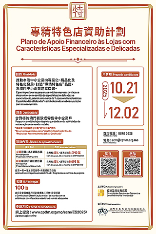 【特訊】為推動本澳中小企業向專業化、精品化及特色化發展,澳門生產力暨科技轉移中心(下稱「生產力中心」)獲工商業發展基金委託,負責執行「專精特色店資助計劃」(下稱「資助計劃」)。該計劃第一輪申請期定於今(二)日截止,生產力中心提醒有意申請或需要補交申請文件的企業盡快辦理相關手續。