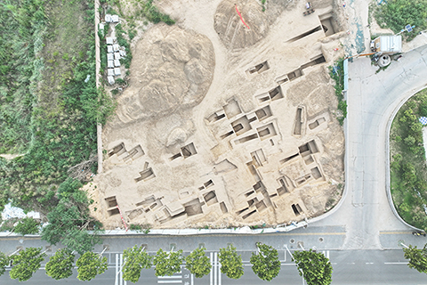 ◎ 十二月二日,據從河南省三門峽市仰韶文化研究中心消息,今年八月至十月,考古人員在當地一建設項目發現四十五座墓葬。墓葬時代涉及戰國、北朝、唐、清等朝代,出土銅簪、塔形罐、銅鏡等文物。圖為二0二五年八月十七日航拍該處古墓葬群。(無人機照片)(中新社發 三門峽市仰韶文化研究中心 攝)