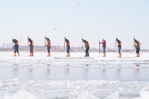 ◎ 十二月九日,黑龍江哈爾濱,採冰工人將冰鑹戳進鋸開的冰縫裡。近日,隨著松花江哈爾濱段的全面封凍,哈爾濱開始進行採冰工作。採冰工人在封凍的松花江上有序地進行劃線切割、分割冰塊、取冰出水及裝車運輸等作業。隨著第廿七屆哈爾濱冰雪大世界園區建設進入加速階段,這些冰塊將被用於冰雕等藝術品的製作。(中新社記者 趙宇航 攝)