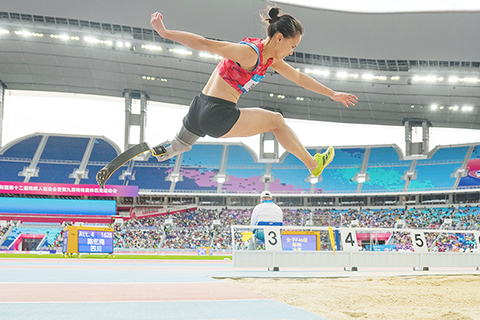 陳憶梅女子跳遠T63級決賽獲冠 2025-12-15 03:30:00 ◎ 十二月十四日,四川隊選手陳憶梅在女子跳遠T63級決賽試跳後整理假肢。最終,她獲得冠軍。全國第十二屆殘疾人運動會暨第九屆特殊奧林匹克運動會田徑項目在廣州落下帷幕。(新華社記者 劉夢琪 攝)