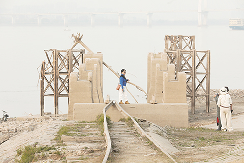 ◎ 十二月十六日,湖北武漢,江邊露出棧橋水泥墩。近日,因長江水位持續降低,位於武昌區徐家棚江邊,粵漢鐵路火車輪渡碼頭舊址棧橋和舊鐵軌已露出水面,顯露真容,以滄桑之態出現在市民視野中。(中新社記者張暢 攝)