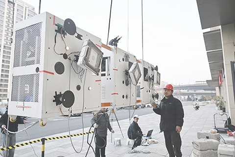◎ 十二月十九日,安徽合肥,科研人員正在調試高空清潔機器人。該機器人由中國科學院(合肥)技術創新工程院先進感知與控制技術中心團隊研發,採用首創的「航母式」機械結構。機器搭載小型作業單元,可貼附於玻璃表面並靈活移動,實現分區域同步清潔,日均作業面積可達一千二百平方米。(中新社記者韓蘇原 攝)