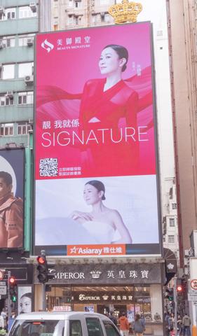 剛播放完畢的TVB台慶劇《新聞女王2》依舊口碑載道,由佘詩曼(阿佘)飾演的Man姐仍然是劇中最重要的話題,阿佘代言的美容品牌Beauty Signature美御殿堂最新超紅色巨型LED廣告也空降香港核心地區的當眼位置,繼續延續Man姐熱潮。