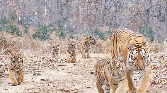 記者12月26日從東北虎豹國家公園管理局獲悉,今年11月8日,在公園的琿春片區監測到一隻雌性野生東北虎帶領五隻幼崽出現,這是中國首次拍到「六虎同框」影像。