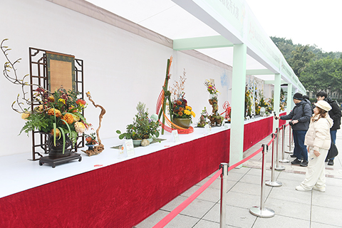 ◎ 一月四日,重慶動物園展出的九十二件成渝花藝工匠精品吸引市民欣賞。元旦假期,一場融合藝術美學與文化內涵的迎春花藝盛宴──二0二六成渝雙城「工匠杯」迎春插花藝術暨組合盆栽花卉大賽在此舉行。據悉,該展覽展出插花藝術和組合盆栽作品共九十二件,其中插花藝術作品五十四件,組合盆栽作品卅八件。(中新社記者 周毅 攝)