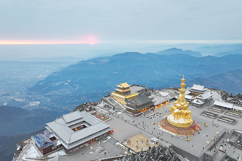 初雪染峨眉 2026-01-09 03:30:00 ◎ 一月八日,四川省峨眉山金頂,一場降雪為山巒和古刹籠上了一層紗衣,整座山巒化作一幅流動的水墨畫。圖為清晨的峨眉山金頂。(無人機照片)(中新社記者劉忠俊 攝)