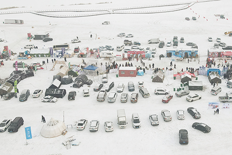 ◎ 十月十二日,在第四屆東北露營大會的鄉村集市上,遊客們在逛大集(無人機照片)。十月十二日,為期一周的第四屆東北露營大會在黑龍江省齊齊哈爾市梅里斯達斡爾族區的草原上開幕。來自全國各地的露營愛好者和遊客踏雪而來,在嚴寒中體驗冰雪露營的獨特魅力與當地火熱的民俗風情。(新華社發 李楠 攝)