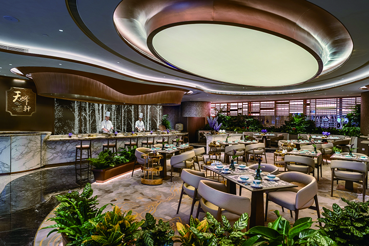 天峰軒星際以亮白大理石為主要裝飾,綴以深色大理石作襯托,劃出主要入座空間。天花以燈光透射出花草圖案,映照著座位區正中央隨季節轉