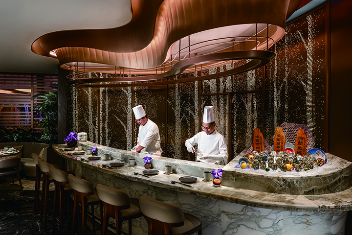 踏入餐廳,一邊是鐵板燒和即席烹調鮮嫩肉類與海鮮,另一邊是即開空運生蠔的生蠔吧,呈現料理表演。可自由選擇享用來自