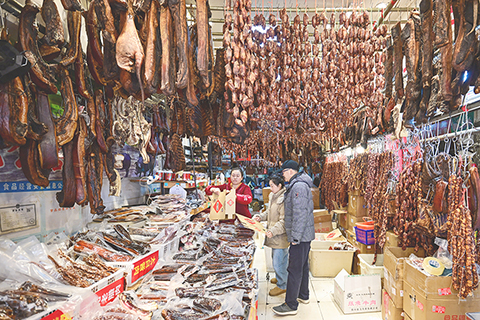 成都:「香腸臘肉一條街」 2026-01-15 03:30:00 ◎ 一月十四日,春節臨近,四川成都青羊區新開寺街臘味飄香。這條素有「香腸臘肉一條街」美譽的街巷,店舖內外掛滿香腸、臘肉等腌臘製品,濃郁臘香引民眾或遊客置辦年貨忙,提前鎖定新春滋味。圖為成都新開寺街一商舖內掛滿了香腸、臘肉等腌臘食品。(中新社記者劉忠俊 攝)