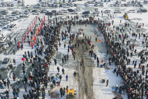 ◎ 這是一月十七日拍攝的二0二六年興凱湖冬捕節現場(無人機照片)。當日,二0二六興凱湖冬捕節在中俄界湖興凱湖畔啟幕。人們在現場共同見證千米大網破冰而出,萬魚騰躍競逐的震撼場景,感受傳承千年的肅慎漁獵文化,體驗北國邊境冰雪文化獨特魅力。本屆冬捕節以「文化+體育+旅遊」融合發展為理念,精心打造全鏈條沉浸式體驗矩陣,將「冷資源」轉化為「熱產業」。(新華社記者 張濤 攝)